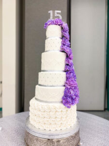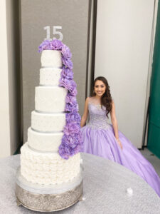 My latest quinceanera cake was over a year in the making. Anissa and her mom came in to taste cake and discuss design in February of 2020. We all now what happened in March….sigh. Anissa turned 15 in August of 2020, but wasn’t able to celebrate until restrictions recently eased. Isn’t she adorable?!
