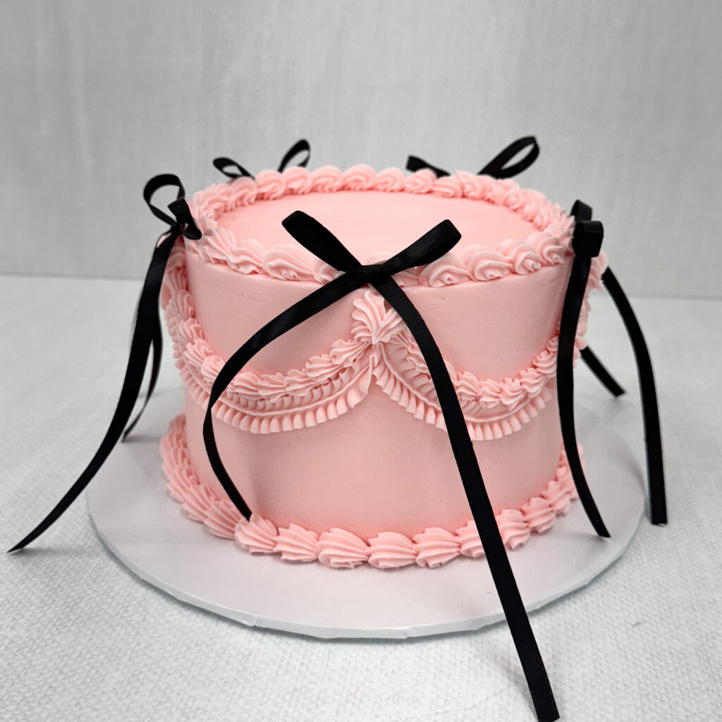 With its pastel pink buttercream base, intricate piping, and bold black ribbon accents, this cake is a modern twist on vintage aesthetics. Whether you’re celebrating a birthday, bridal shower, or intimate gathering, this cake adds sophistication and personality to your event.