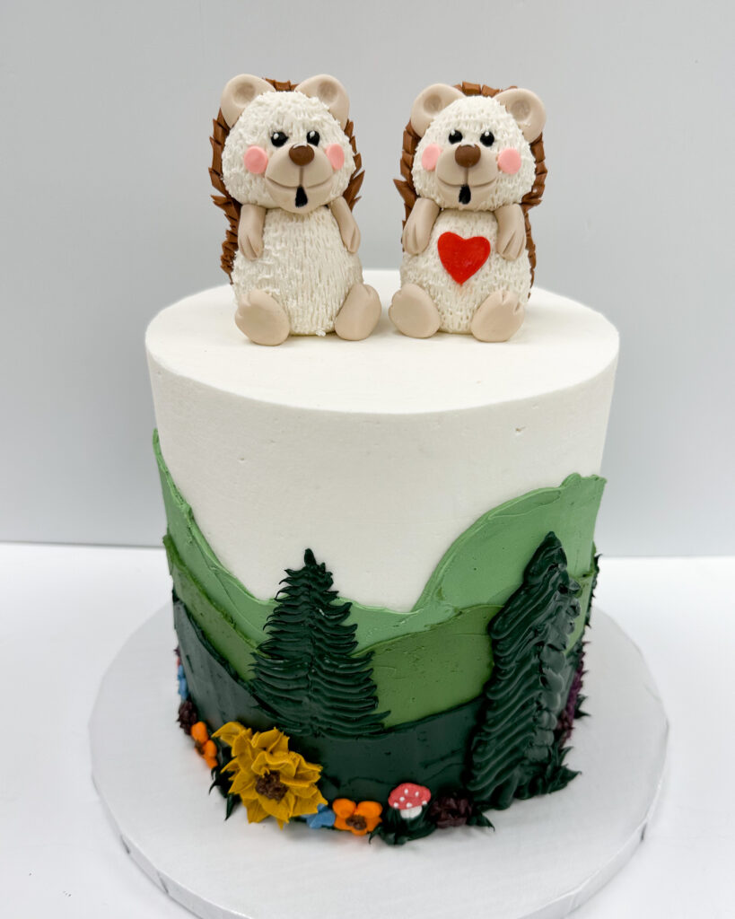 At All Things Cake, we take pride in creating cakes that are as unique as the stories they celebrate. One of our recent creations features an enchanting woodland-themed design that’s sure to charm anyone who lays eyes on it. This delightful cake, adorned with adorable hedgehogs and lush greenery, is a perfect example of how we transform themes into edible art.