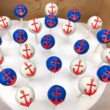 The dessert table also included nautical themed cake pops. For the cake pops, we cut out small anchors in red fondant. We then dipped our cake balls in white and blue chocolate and then attached an anchor to each one. We also created sailboat sugar cookies and iced them in red, white and blue royal icing. The cookies are not pictured individually, bu can be seen on the dessert table below.