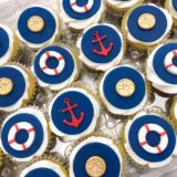 For additional servings on the dessert table, we added nautical themed cupcakes. We started by cutting out our 2″ blue discs in fondant and let them dry. We then added gold buttons, anchors and ring buoys. We piped a buttercream rosette on the cupcakes and then placed a decorated disc on each one. They coordinated the cake perfectly!