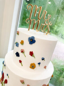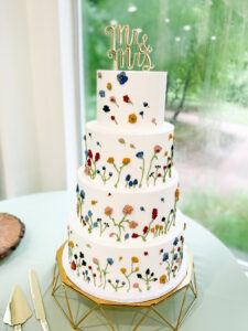 We are well into the 2022 wedding season and seeing a variety of gorgeous trends emerge! The pressed flower look made the rounds through the Spring and Summer, which featured smooth buttercream with flat, real (edible) flowers placed around the tiers. This bride loved that look, but wanted to keep the design all buttercream and in her color scheme.