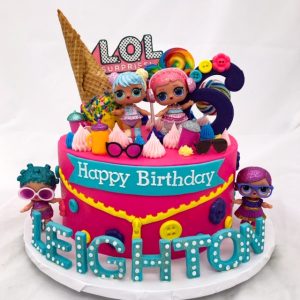 So….for every Fortnite cake we do for the guys, we do an LOL Surprise cake for the gals! These cakes are super fun and fiesty with lots of colors and