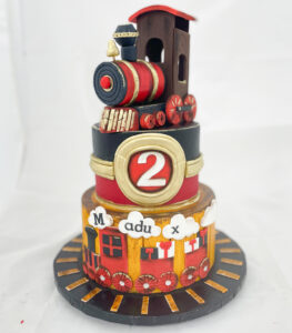Who doesn’t love a train theme party? I loved everything about this cake from the vintage train topper to the wood grain and gold accents. It was definitely not your