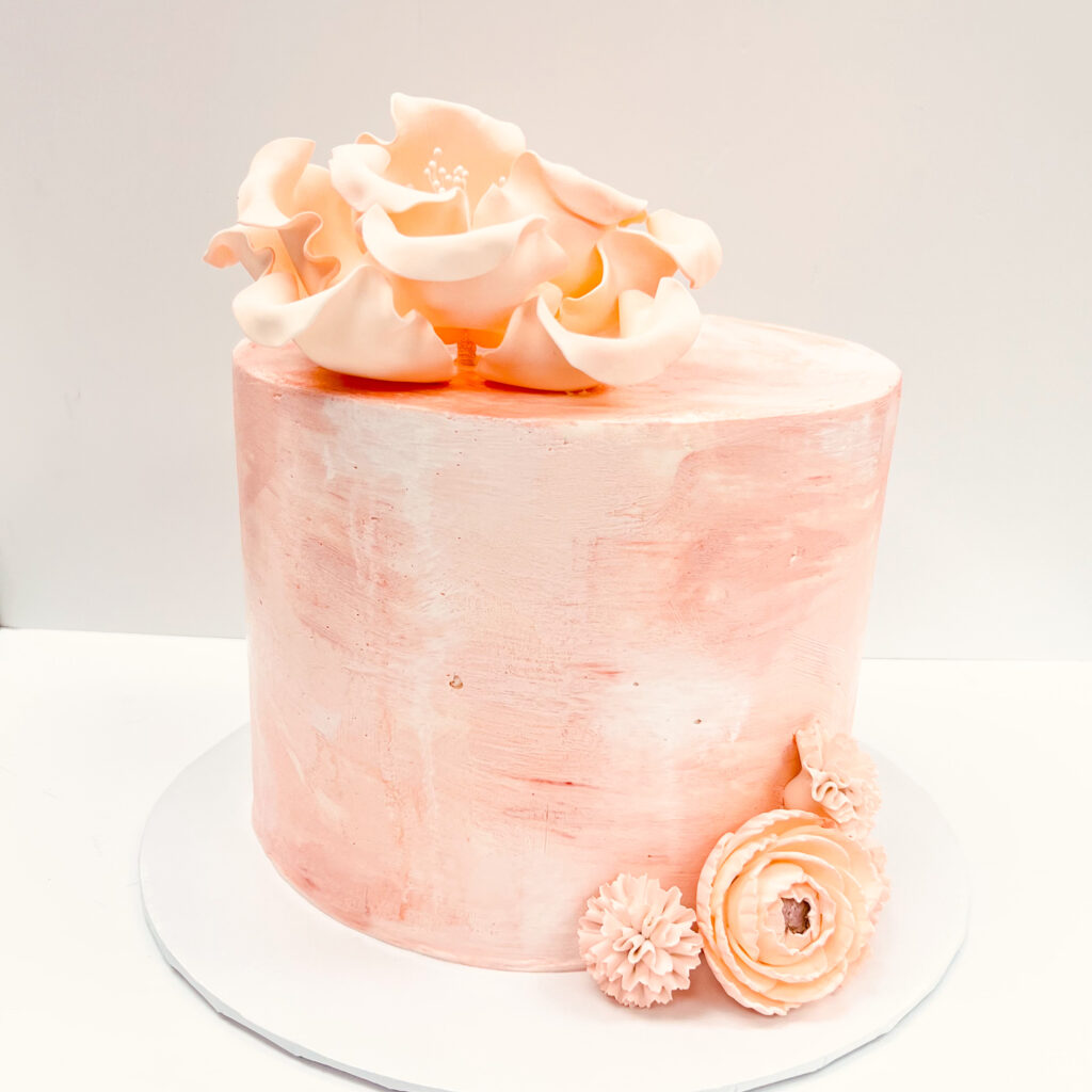 This petite cake is a 6″ round to serve up to 10 people. We iced in in peach buttercream and added brush and spatula strokes around the sides. We then