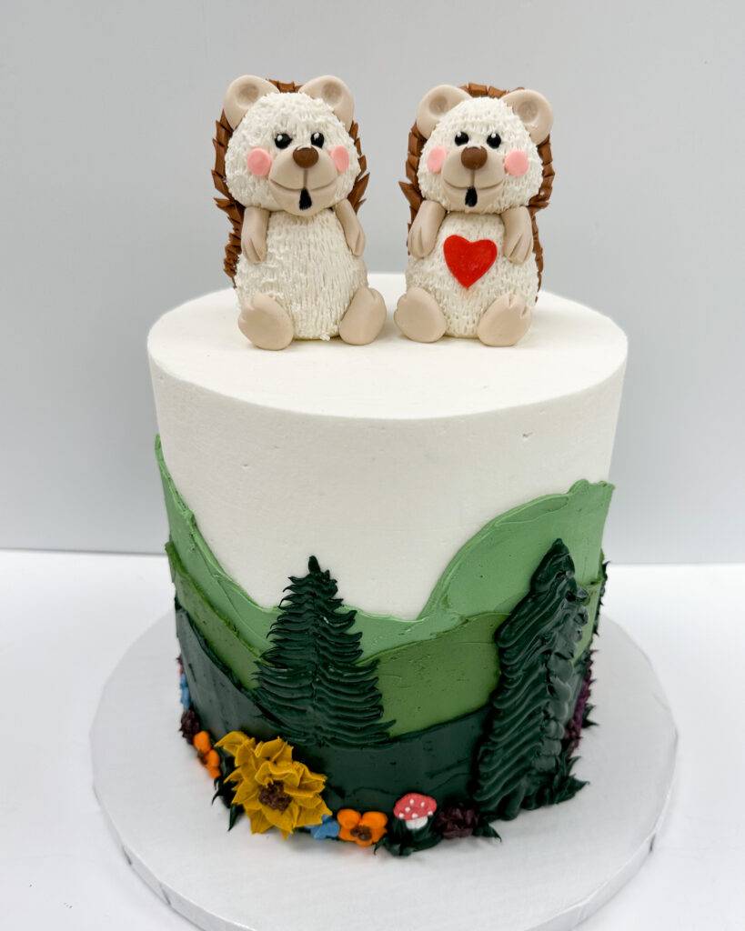 Cake toppers don’t get cuter than this! This cake was a 6″ round jumbo (6″ tall tier) to serve about 15 people and was iced in buttercream. We iced the