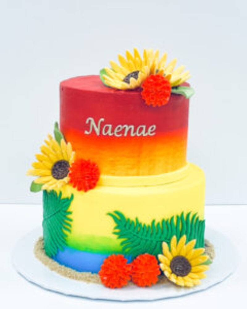 Sunny colors. Sunflowers. Sunset fade. This cake is giving off the best sunny feels! For this two-tier cake, we started with two separate cakes that we leveled, filled and crumb