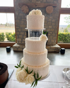 How sweet is this cake?!? This was a small wedding cake for the sweetest couple! For this cake, we started with two tiers. Whenever we have a small wedding we