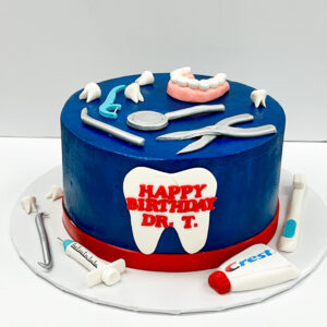 Happy Birthday, Dr. T! This 8″ round cake (to serve 16) was iced smooth in blue buttercream. We then added a red fondant band around the base and a tooth