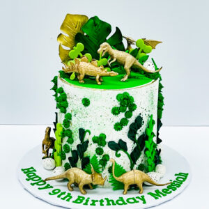 We do A LOT of dinosaur theme cakes and every single one is different! This was such a fun one to create! For this cake, we started with a 6″