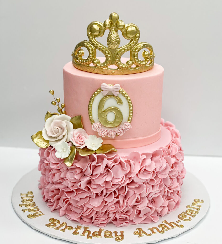 Is there such a thing as too much pink? Especially pink paired with gold? We don’t think so and neither did this client. This was a small cake – 6″