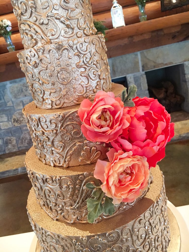 We took several trends and combined them to create this 5 tier beauty that will serve just under 150 people. We mixed traditional 4″ tiers with a jumbo 6″ tier on the bottom to give this cake a little more height. We placed it on a pedestal cake stand, which is very popular right now. Additionally, we lightened our gold a little to give it more of a champagne/gold hybrid feel. Then we added a pop of coral with the florals, which is the Pantone color of the year for 2019. All these trends came together to create a sophisticated and elegant look.