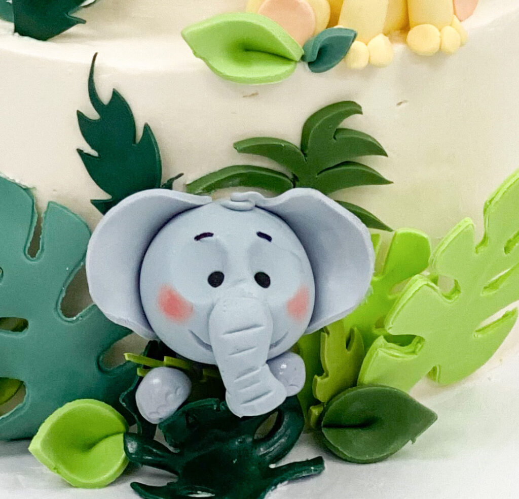 We started creating elements for this cake about a week before it was due. We needed to give the leaf accents and animals time to dry. When creating 3D fondant sculpted animals, you always have to do them in phases. You will start with the body and head separate. If you try to assemble to animal too quickly, the weight of the head can squish the body or cause the fondant to wrinkle. To avoid this, we created the core pieces and let them dry. Once dry, we were able to assemble limbs, ears and tails.