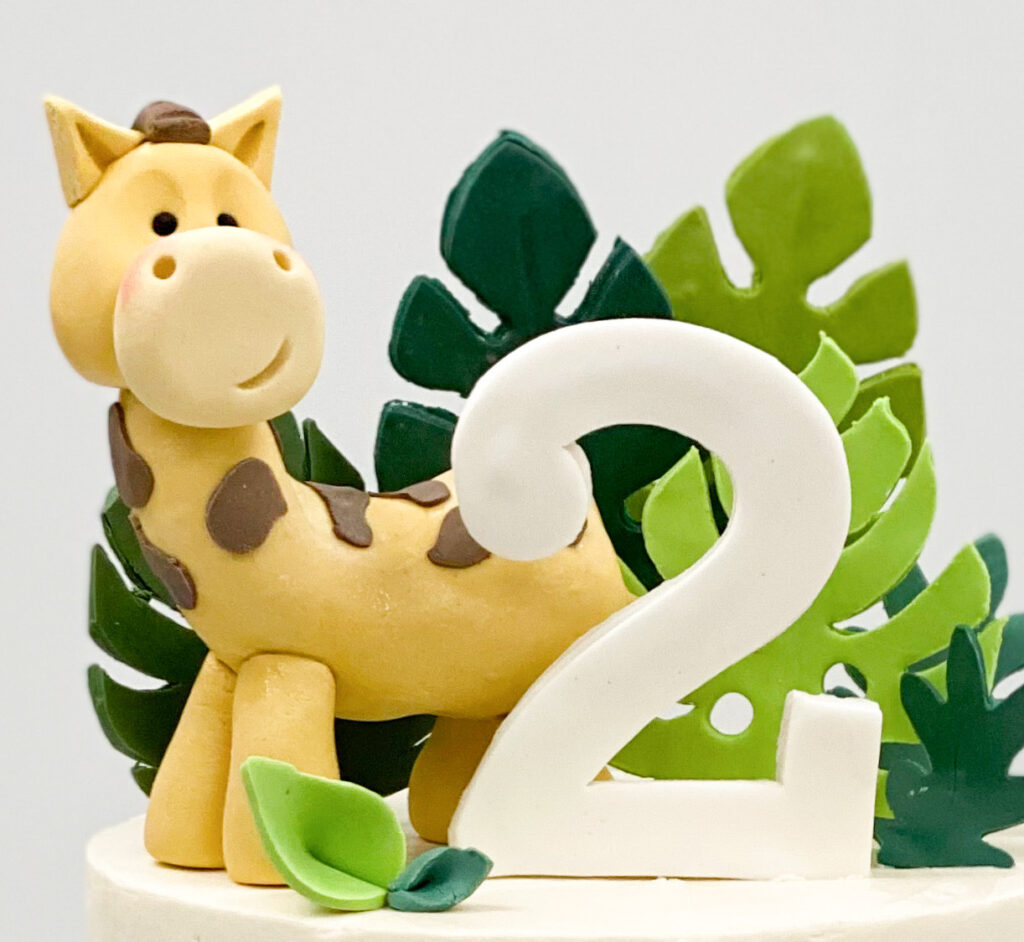 When it came time to actually create an assemble the cake, we iced each tier in off-white buttercream and let it chill in the fridge. We then stacked the tiers and added the birthday girl’s name, “Chloe” on a wood-like plaque. This didn’t need to be made ahead of time sinde it’s placed directly on the cake. We then added all the leaves and animals to the cake in a staggered pattern to balance the design.
