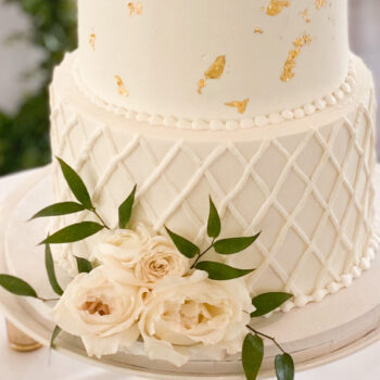 And let’s chat about this design! Each tier was iced in white buttercream, super smooth and level.  On the bottom tier, we added a quilted impression and piped over it to make it a raised pattern.  The remaining tiers were kept smooth and we added edible gold leaf accents to them.
