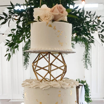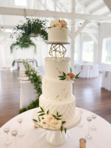 The gold geometric separator was placed at delivery along with fresh flowers and greenery. It was so dreamy and romantic with all the little details from the petite bead border at the base of each tier to the ring of rosettes under the geometric separator.  Sometimes cakes with different patterns and finishes are busy or cluttered, but this cake was just lovely and complemented the reception perfectly.  What is your favorite part of this cake?