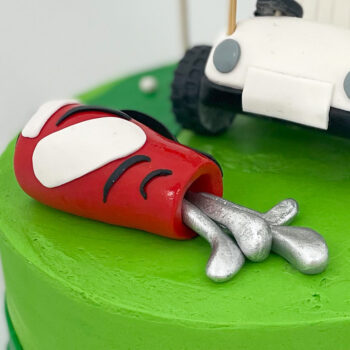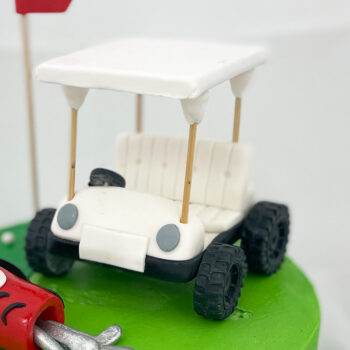 We started wth a smooth and level base of lime green and added some darker green rolling fondant hills. For the fondant toppers, we created a golf bag with clubs, a flag and a golf cart! You can always add toy toppers, but if you can make them, why not?!