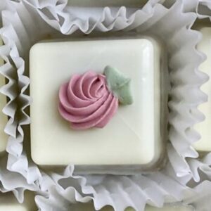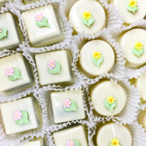 Our petit fours come in round or square and can be coated in a thin shell of chocolate or white chocolate. Inside these delicious treats you will find two layers of cake and a filling sandwiched in between.