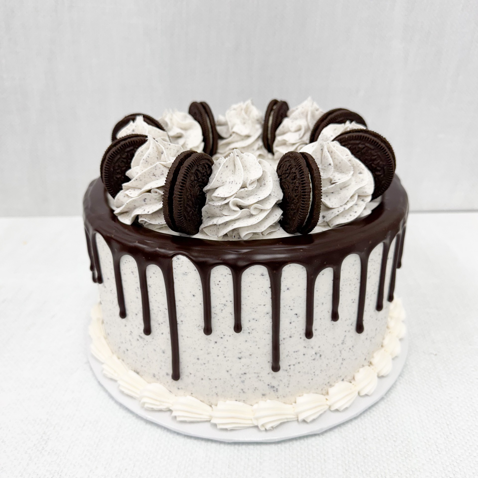 Iced in Cookies & Cream Buttercream & Topped with Oreo cookies.