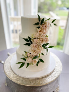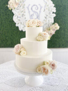 So there you have it…a perfectly smooth, straight and level cake! This makes the cake a perfect blank canvas to add florals or other accents to! This is trending right now in the weddings that we are doing. Brides are wanting a cake that tastes delicious, but isn’t over decorated or busy. The smooth trend allows brides to add pops of color with their florals and greenery…and we’re here for it!