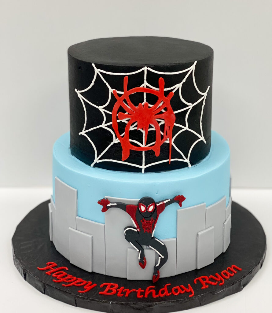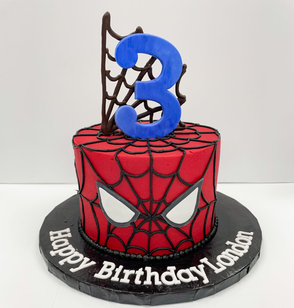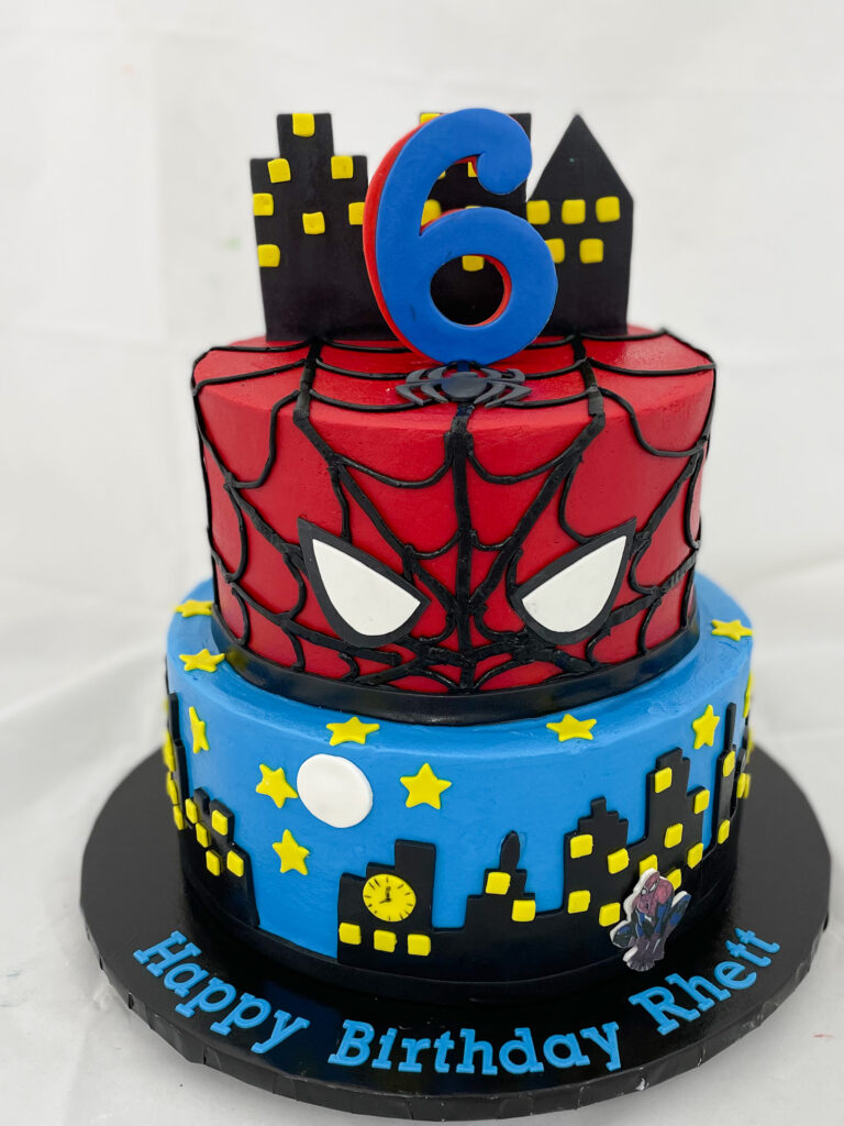 We have had so many fun Spider Man themed cakes and requests lately! Anytime there’s a new movie or popular TV show, we always get an influx of specific cakes. This week it was Spider Man…so fun! We love this theme because of the vibrant colors and variations in designs. From the webbing to the night sky, there are so many cool options!