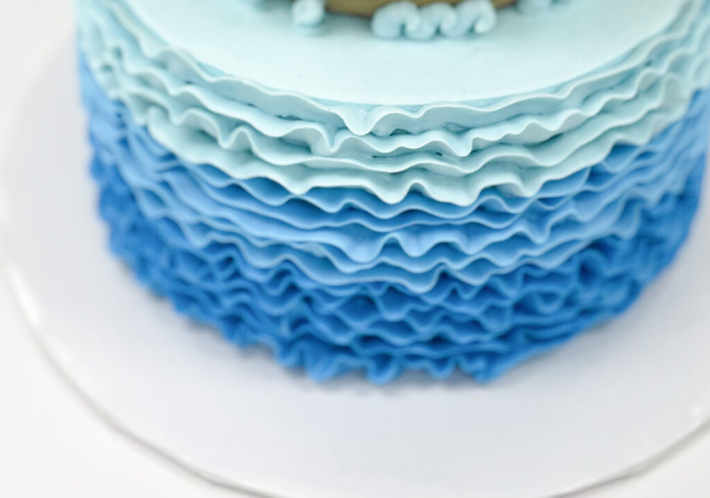 As the party date approached, we baked the cake, leveled it and began to assemble the cake. We filled and crumb coated the bottom tier and added buttercream ruffles in an ombre pattern on this tier to mimic water and waves.