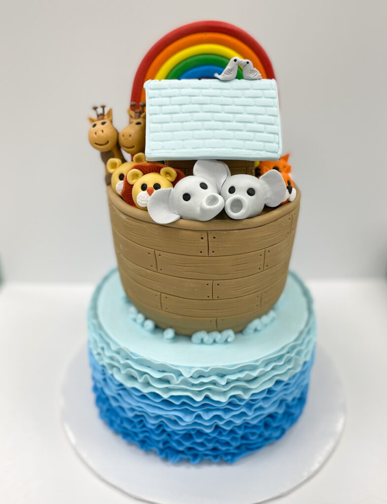We then carved the top tier to give the cake a more rounded/boat look. We added a filling and crumb coated this tier and then added fondant pieces to look like wood slats. Once each tier was ready individually, it was time to stack the tiers and assemble the final look. We added the top of the ark, the rainbow and the animals to complete the look. What do you think?